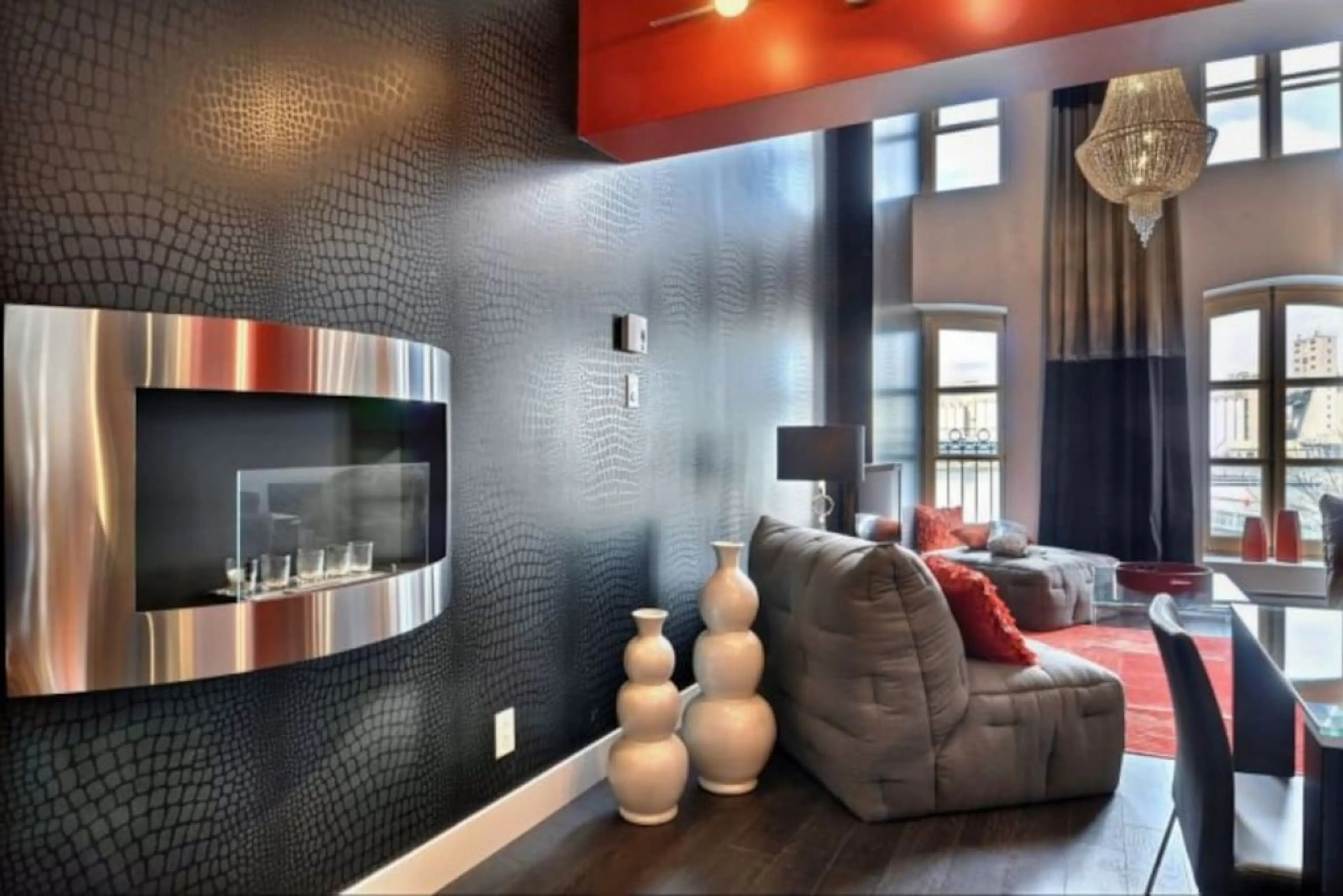 1200 sq. ft. condo located on the fourth floor of an entirely renovated Old Port building. Its theatrical decor with bright colours is matched by the luxury of its lighting, large windows and 20 ft. ceilings. Open-concept area with well-equipped kitchen, dining room and living room; Open bedroom w...
